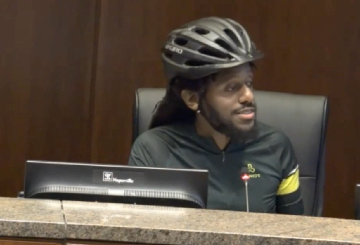 Caption: Senator Simmons attends the Naperville hearing in full cyclist gear, bringing attention to the need for multimodal transportation improvements in conversations regarding public transportation.