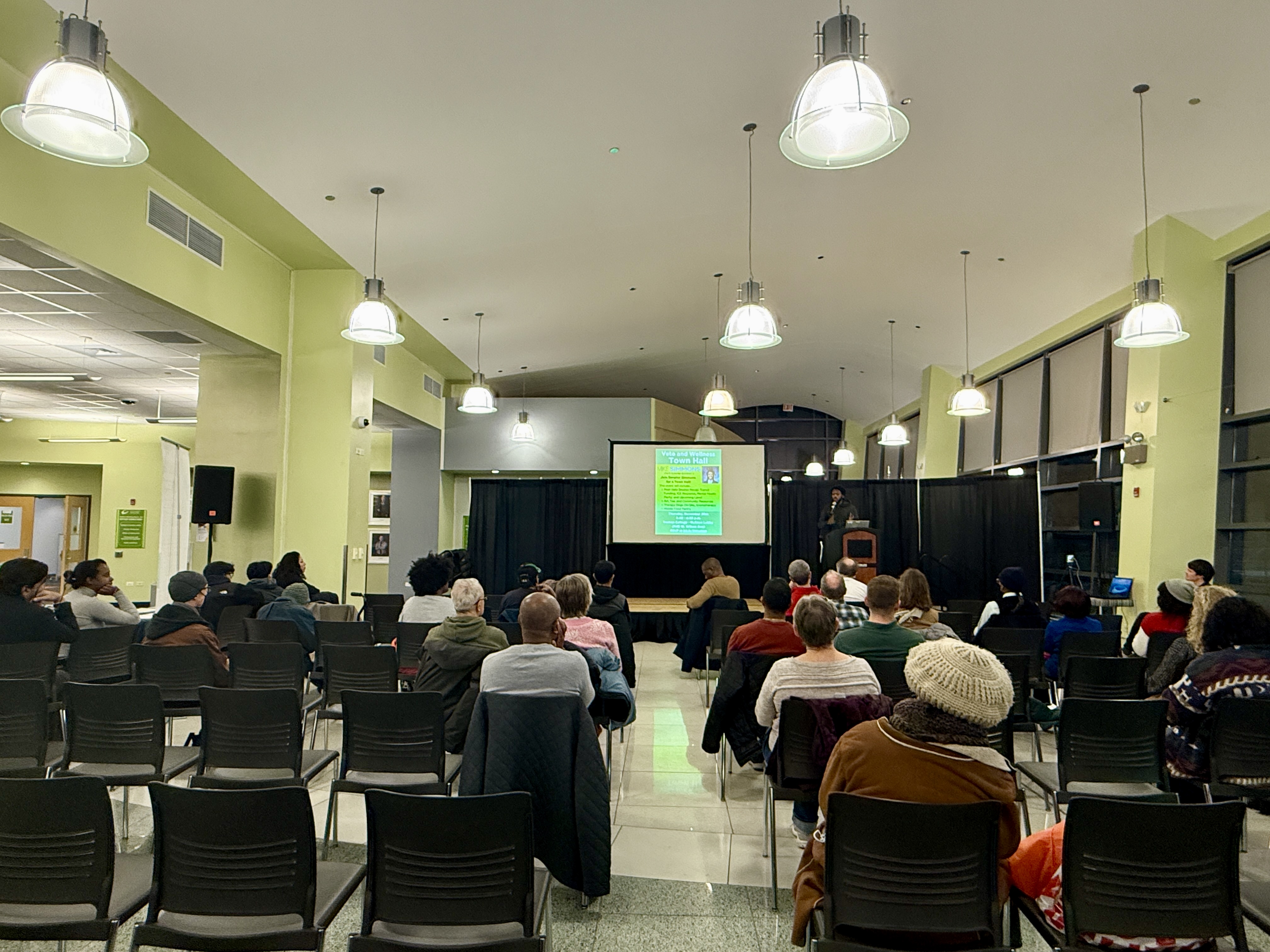 Caption: Senator Simmons speaks at his Town Hall at Truman College on Thursday, November 20.